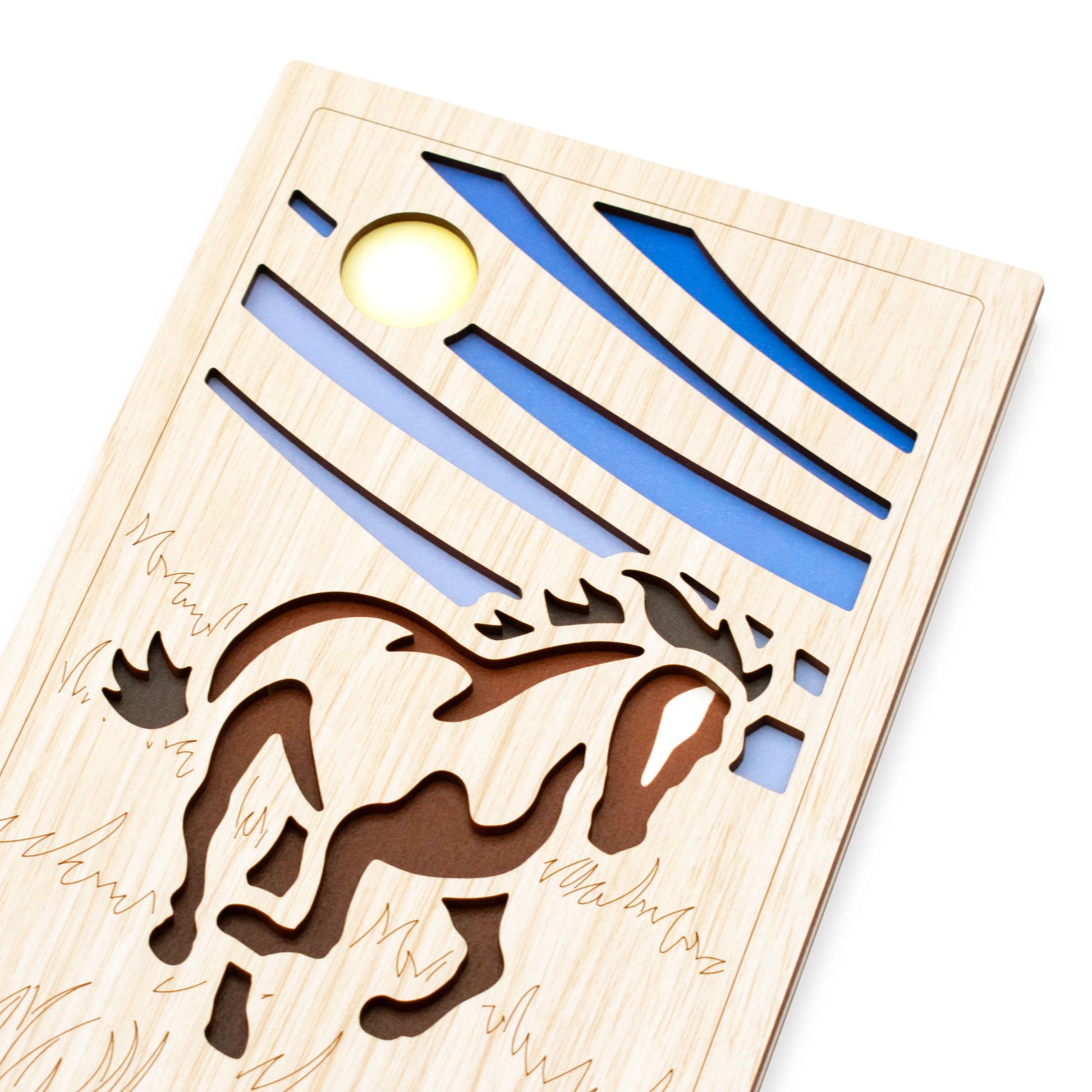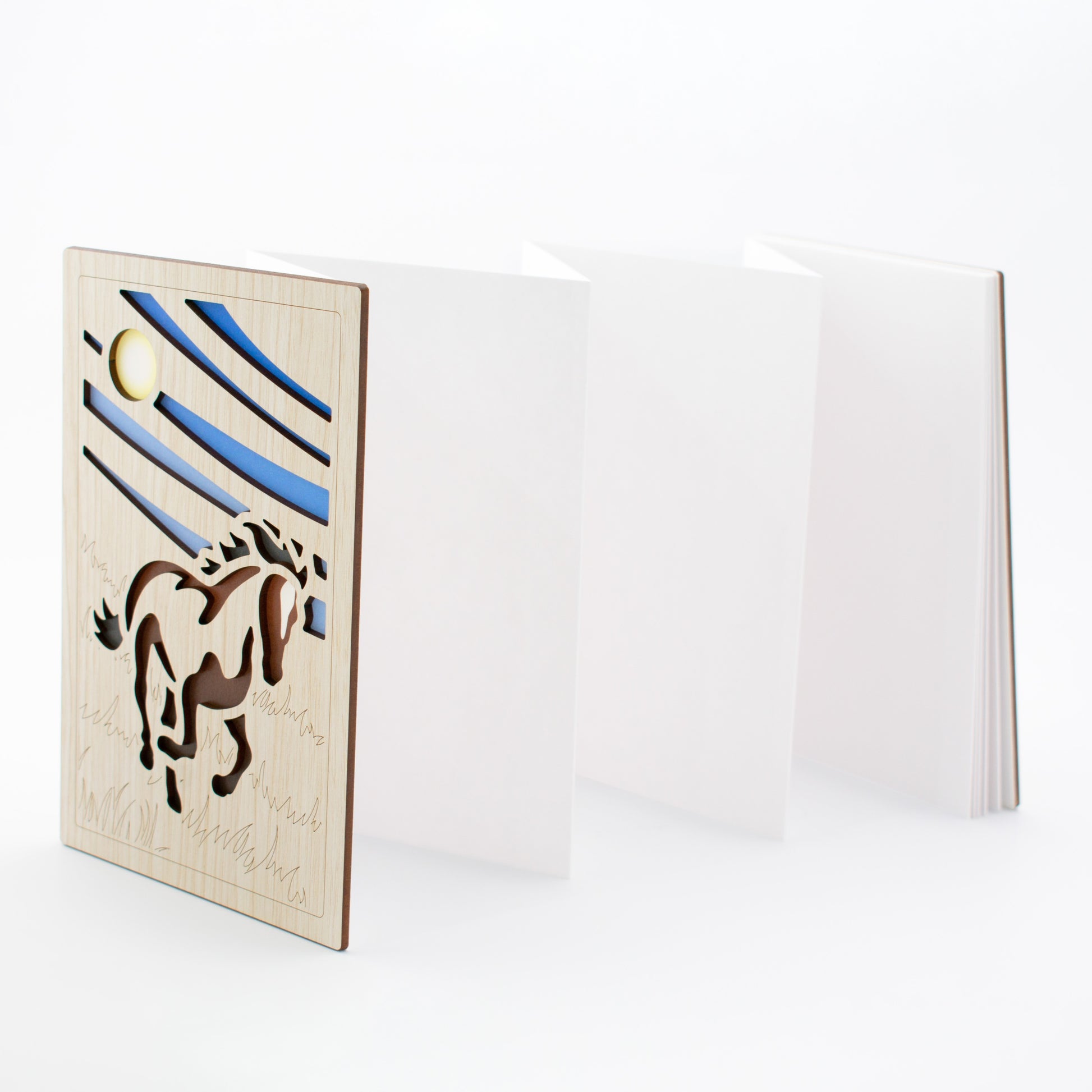 その左馬を、草原を駆ける馬の姿で表現した木製表紙の御朱印帳です。