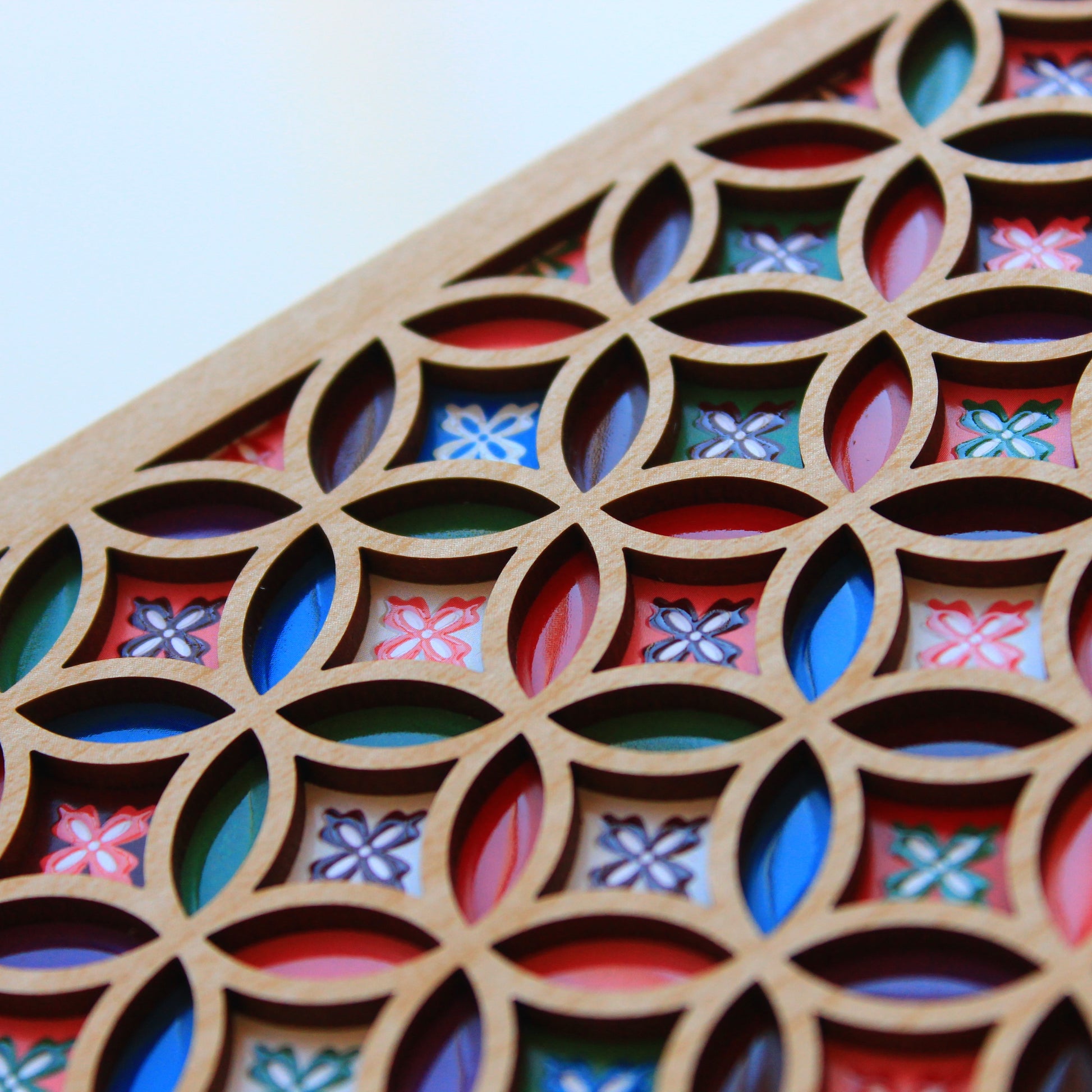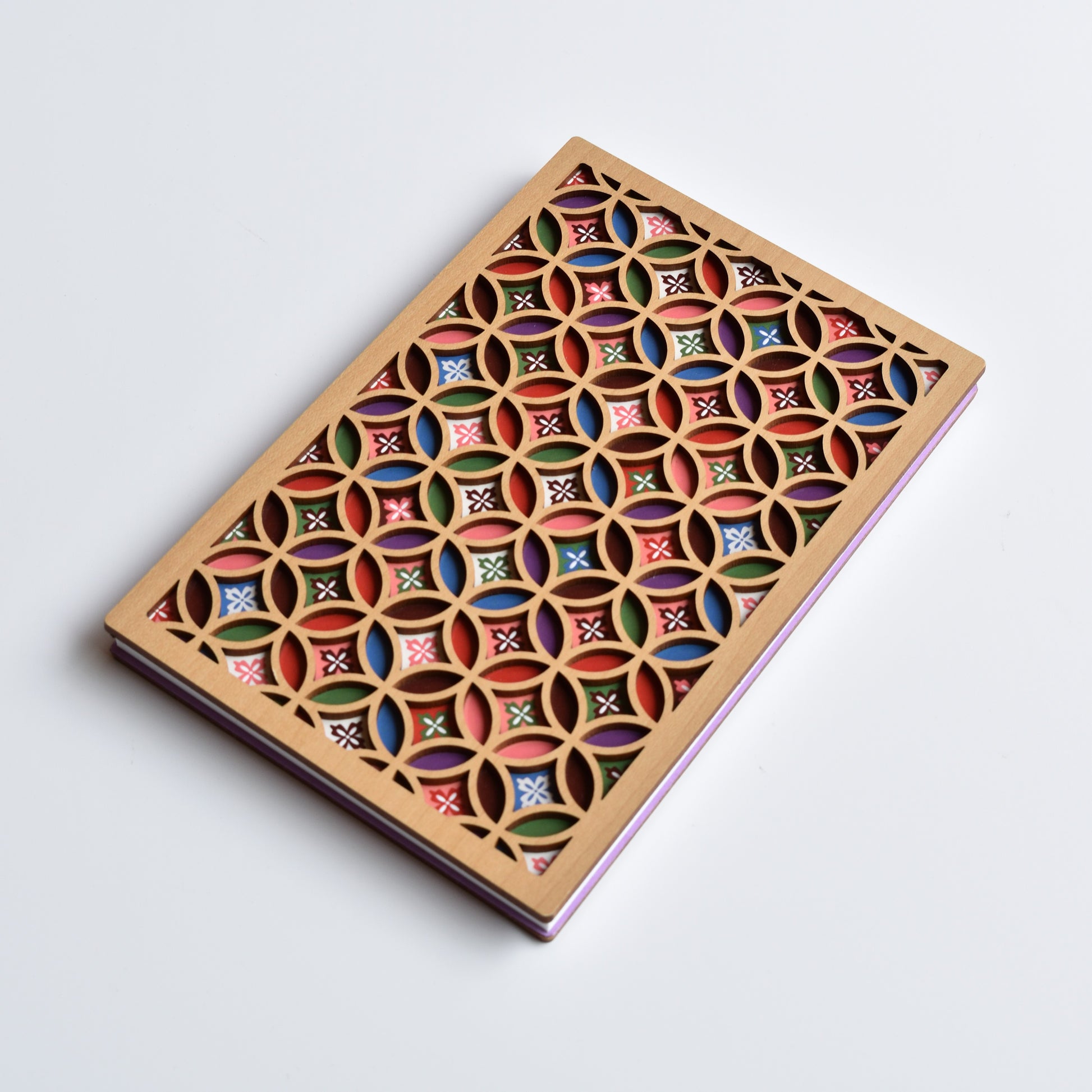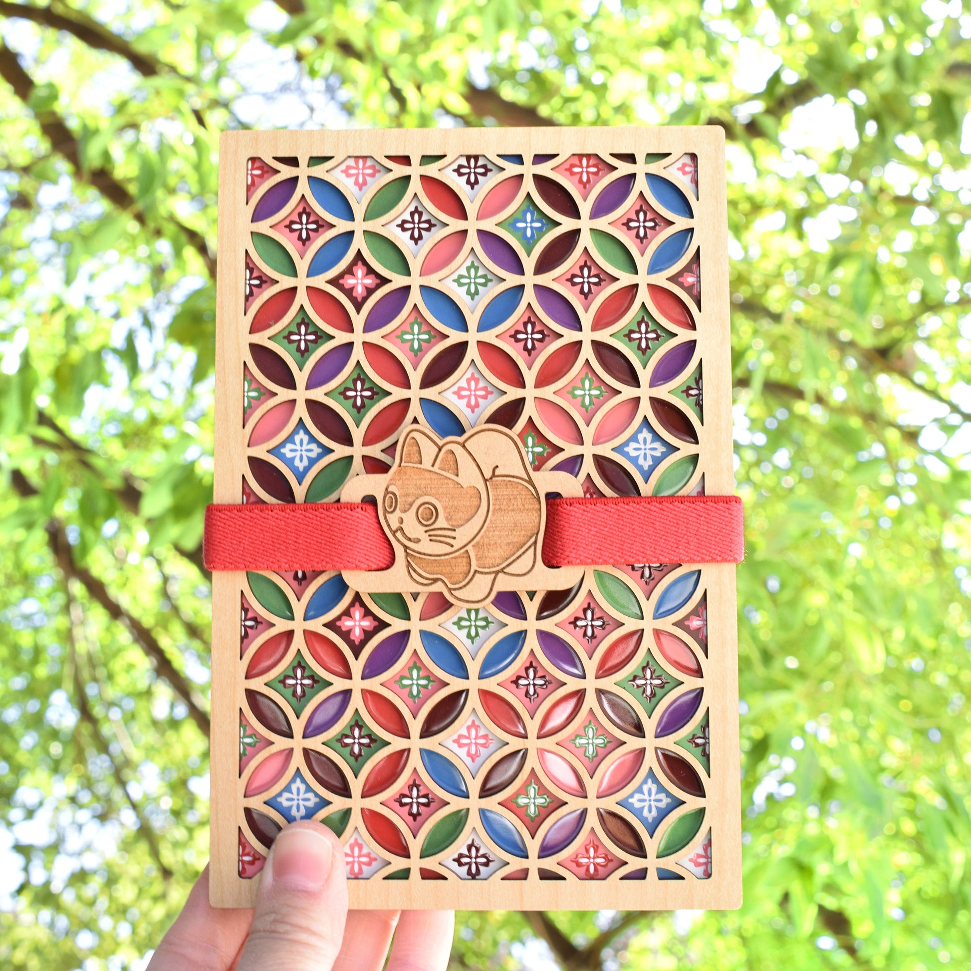 レーザー加工を施した木素材で表紙を仕立てたオリジナル御朱印帳。