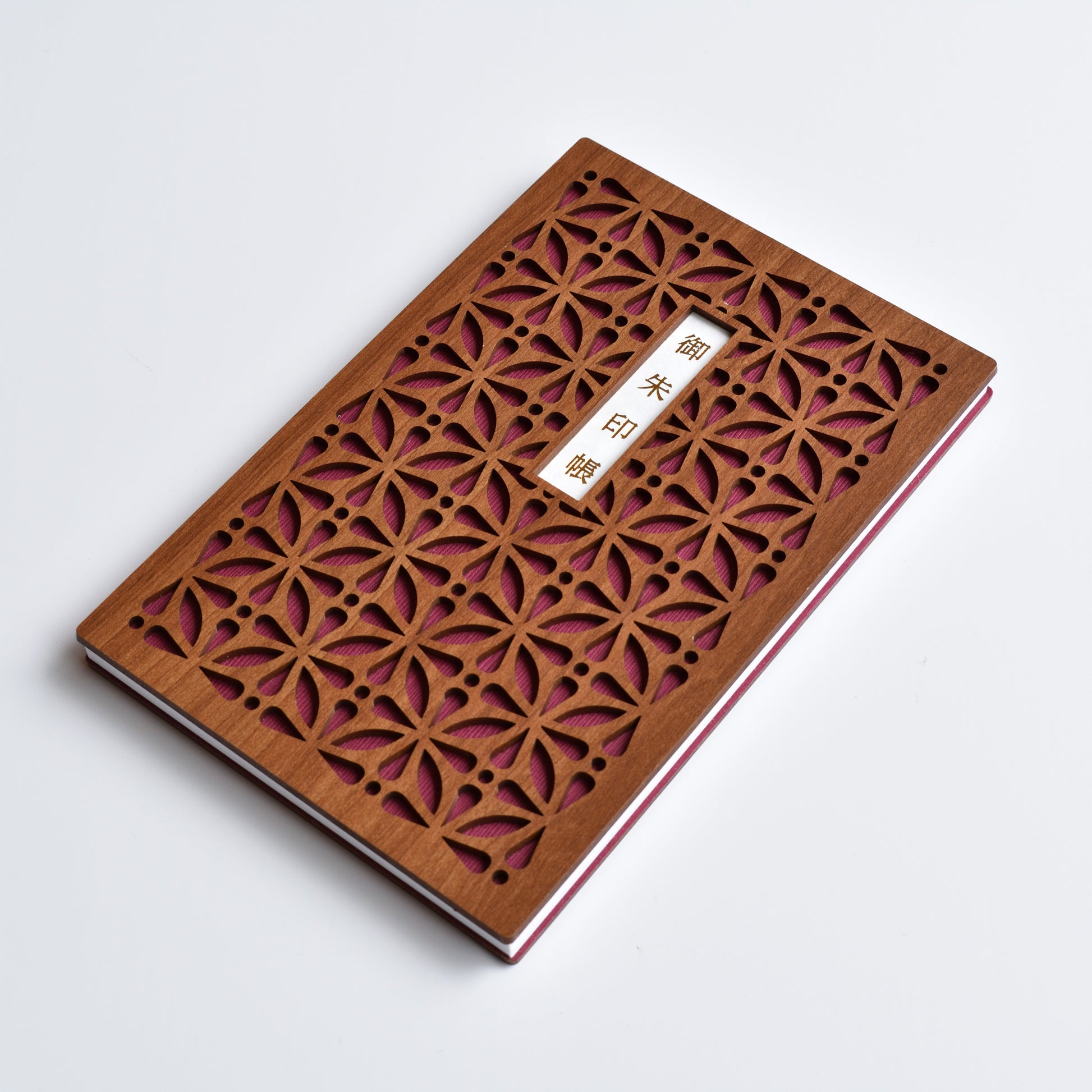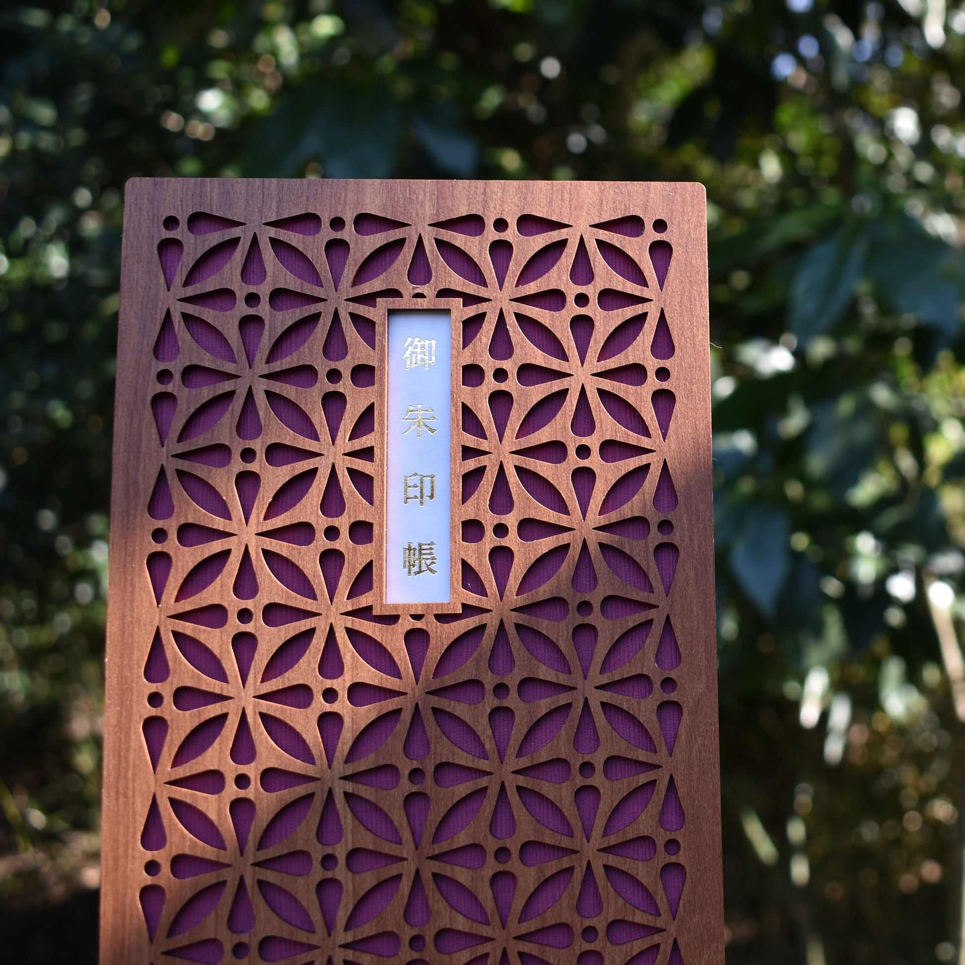 レーザー加工を施した木素材で表紙を仕立てたオリジナル御朱印帳。